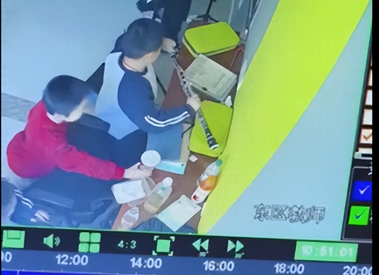 李某说,监控视频显示,当日上午,隔壁书法班的学生下课后,擅自将训练室的门打开,拿着乐器挥舞并且乱按胡吹,还将装在哨片盒里的哨片扔在地上损坏或拿走。