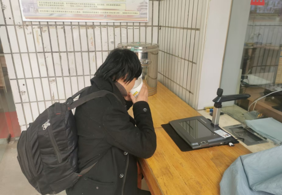 (李某某在郑州市二七区救助站喝热水)
