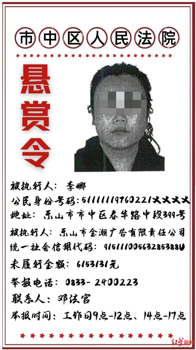 公告显示,若向乐山市市中区人民法院举报、提供被执行人乐山市金潮广告有限责任公司、李娜的可供执行财产线索,经查证属实并实际执行到位的,申请人承诺按变现金额的30%支付悬赏金;悬赏期限自2024年12月5日起至本案执行完毕止。法院将对举报人的身份及相应信息予以严格保密。