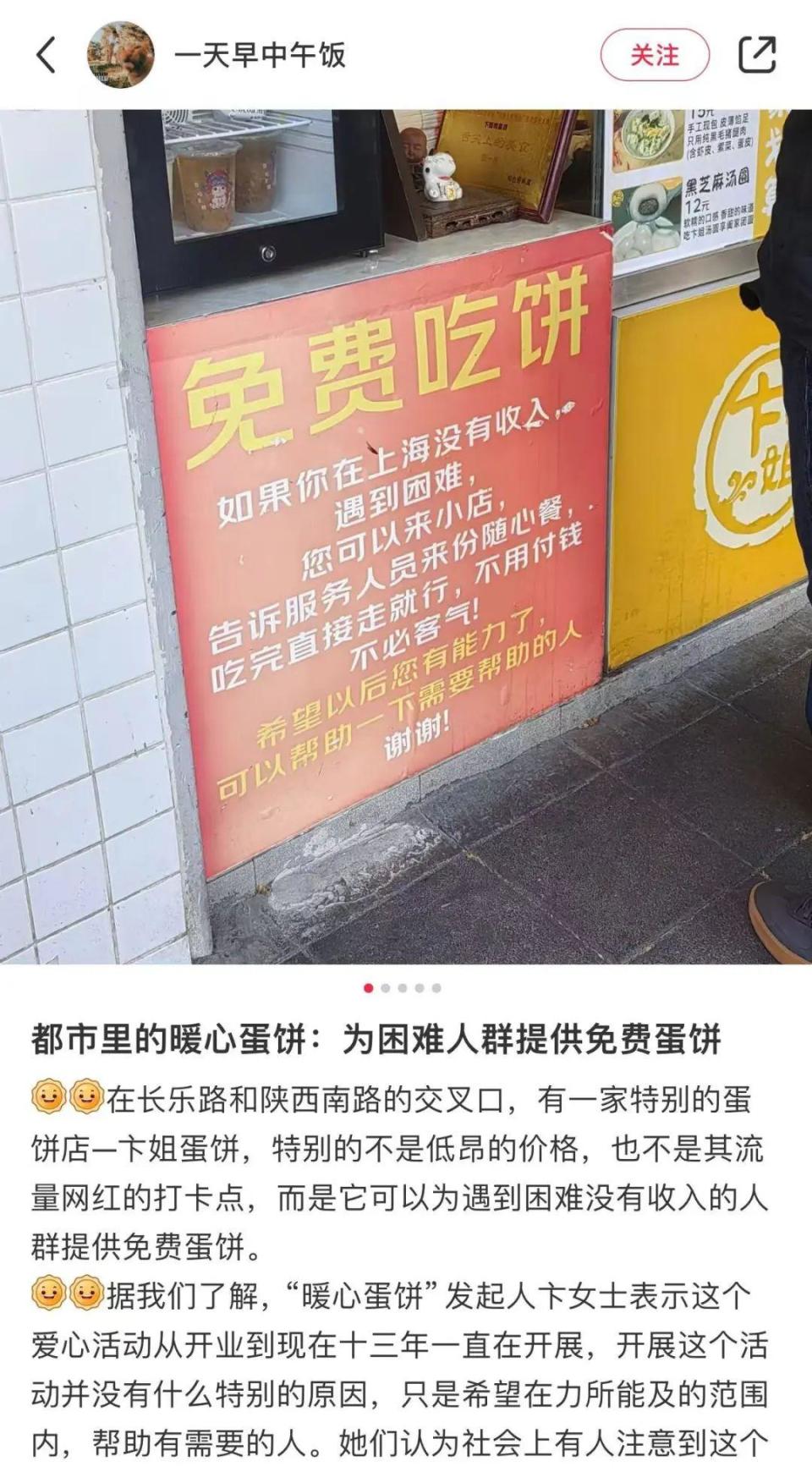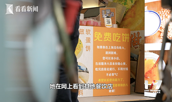 她在店里贴出了一张“免费吃饼”的广告:如果你在上海没有收入,遇到困难,可以来小店,告诉服务人员来份爱心餐,吃完直接走就行,不用付钱,不必客气!希望以后您有能力了,可以帮助一下需要帮助的人。