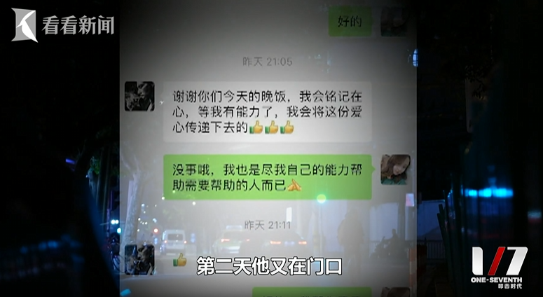 用完餐后,这位来自贵州的年轻人主动加了甜甜的微信,发来了一句话:“谢谢你们今天的晚饭,我会铭记在心,等我有能力了,我会将这份爱心传递下去的。”