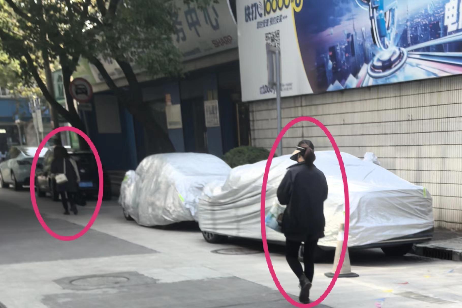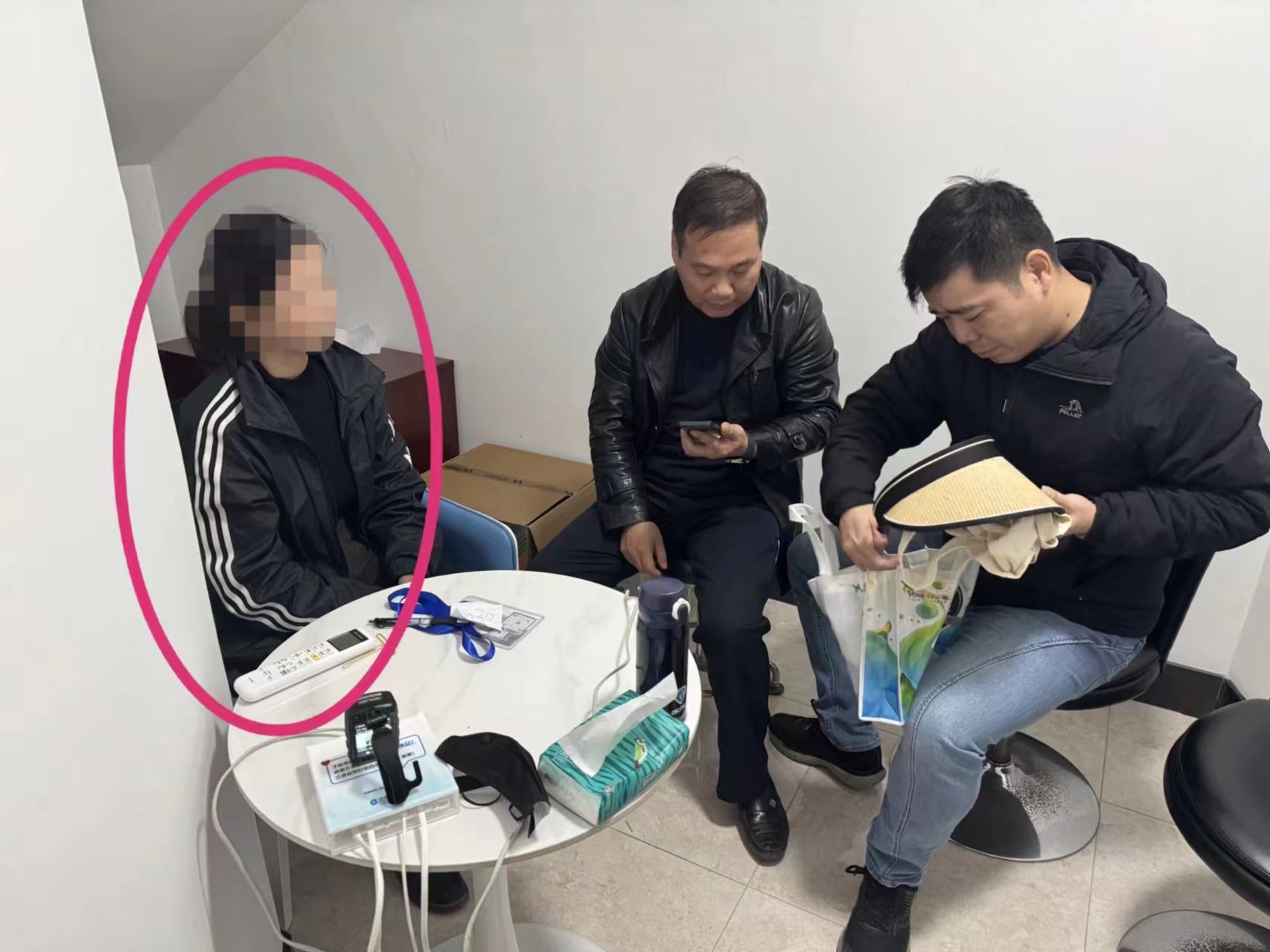 犯罪嫌疑人黄某某(后)与阮某某接头后准备交接赃款。本文图片均为上海崇明警方提供