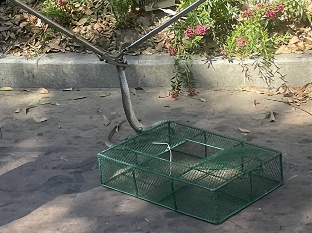 敲打片刻后,毒蛇闻声而出。消防队员见状,立即将捕蛇钳放置在洞口,瞅准时机两边夹击一把夹住蛇头,将其牢牢控制住,并成功拖出,妥善放进笼子,成功消除安全隐患。经核实,这条毒蛇确实就是眼镜王蛇,长约90厘米,体型较大、毒性极强。