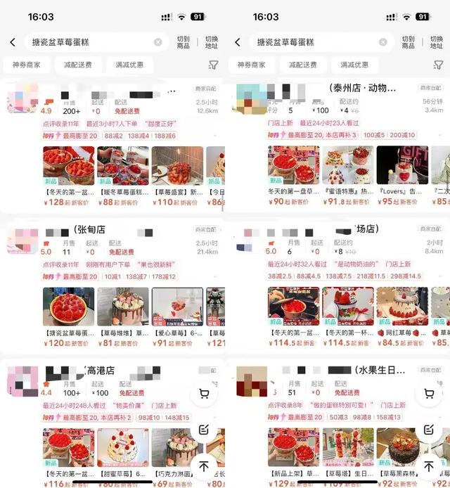 在外卖平台上搜索发现,同款搪瓷盆蛋糕在售的店家也不在少数,售价多数在100元左右。