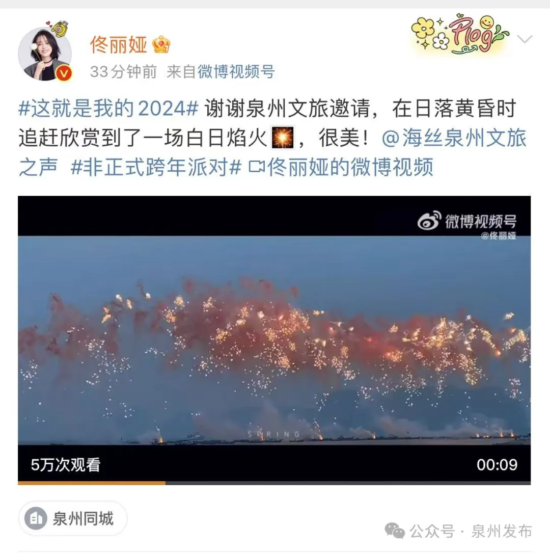 佟丽娅发微博点赞:“谢谢泉州文旅邀请,在日落黄昏时追赶欣赏到了一场白日焰火,很美!”