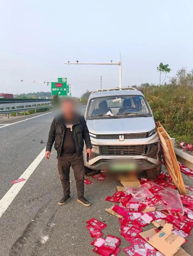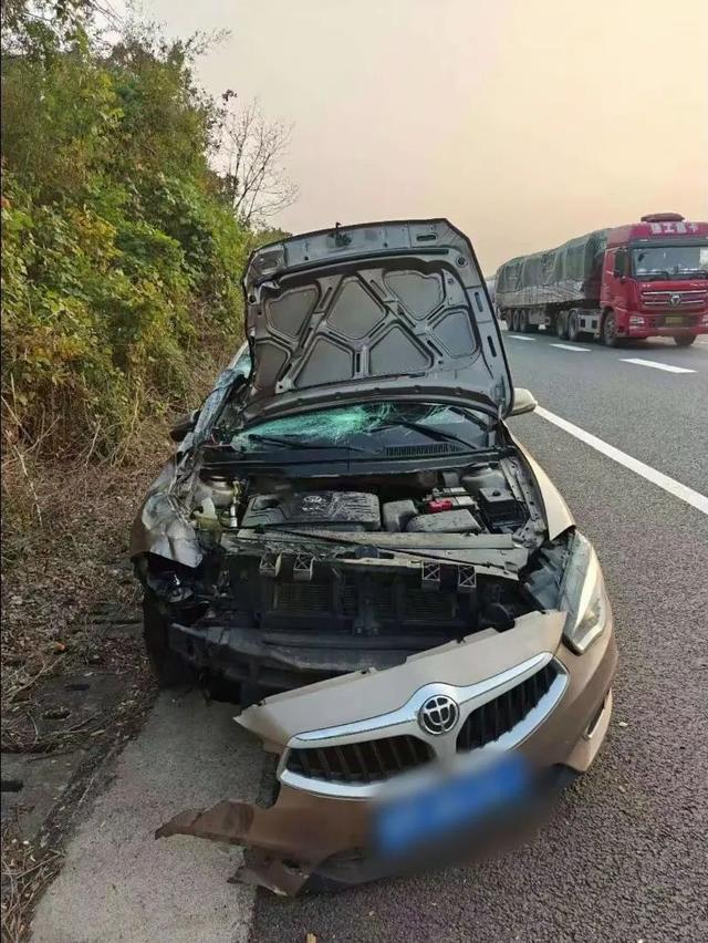 12月3日16时许,许广高速岳阳段南往北方向633公里处,一辆小车突然偏离方向径直撞上一辆小货车,导致小货车发生侧翻,车上货物洒落一地。小车前部受损严重,挡风玻璃破碎、引擎盖弹起、前面保险杠掉落。所幸两车驾驶人均系好了安全带无人受伤。