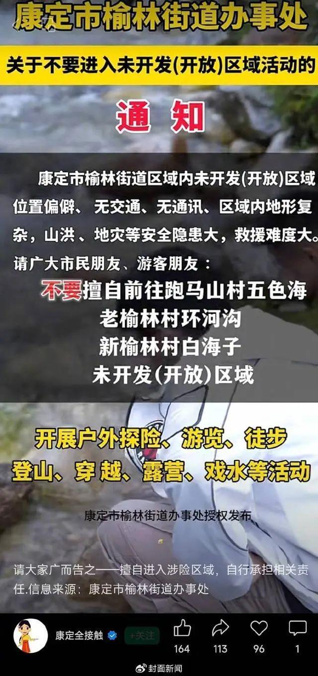 冰海子在康定白海子里面,康定市榆林街道办曾就辖区内未开发(开放)区域发布禁令,其中就包括白海子。