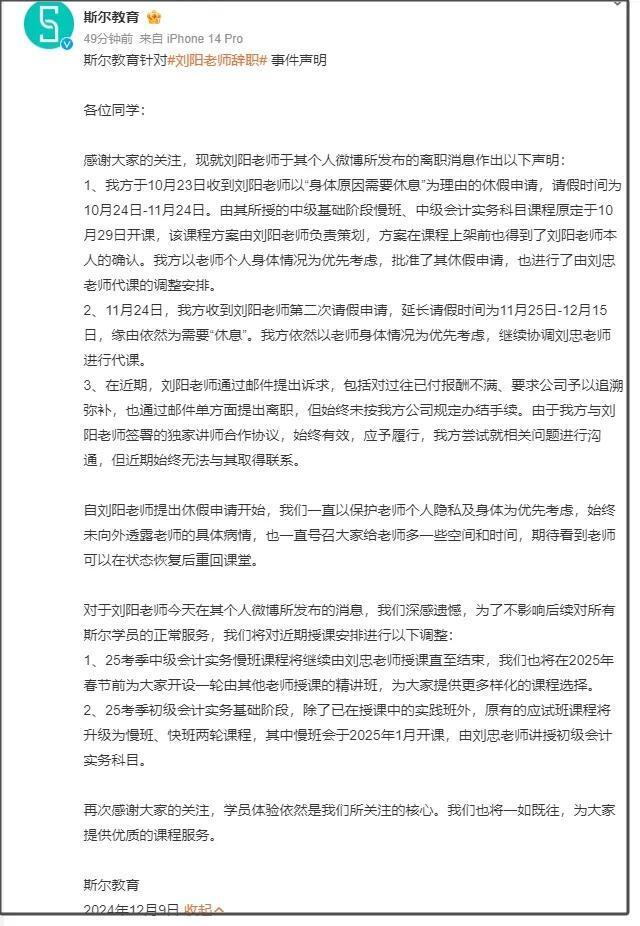 很快,她曾经所在的机构“斯尔教育”发布了一则事件声明称,刘老师一直因身体原因延长休假,并对报酬不满要求弥补,沟通无果后深感遗憾,已调整授课安排。