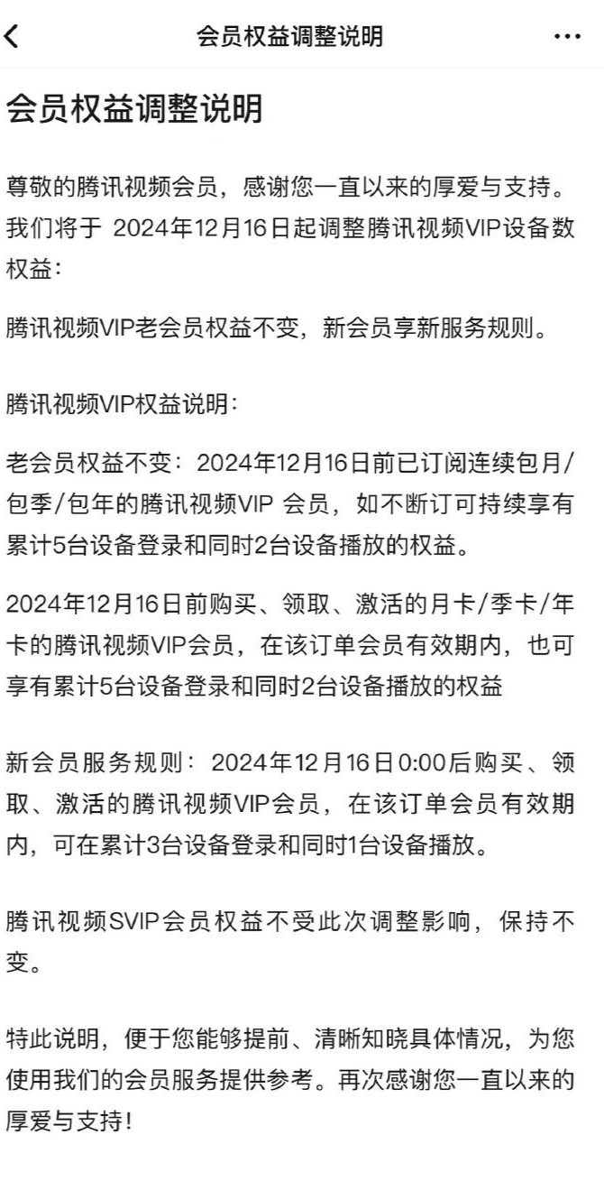 同时,老会员权益不变,2024年12月16日前已订阅连续包月/包季/包年的腾讯视频VIP会员,如不断订可持续享有累计5台设备登录和同时2台设备播放的权益。