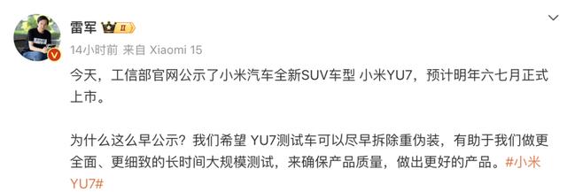 关于为什么明年上市的车要提前公布,雷军表示,“我们希望YU7测试车可以尽早拆除重伪装,有助于我们做更全面、更细致的长时间大规模测试,来确保产品质量,做出更好的产品。”