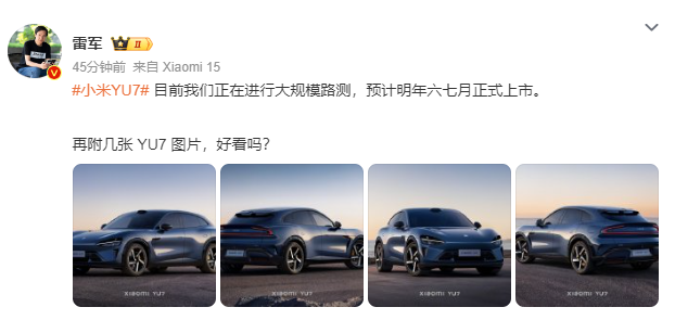小米集团董事长雷军12月10日在微博表示,小米YU7目前正在进行大规模路测,预计明年六七月正式上市。