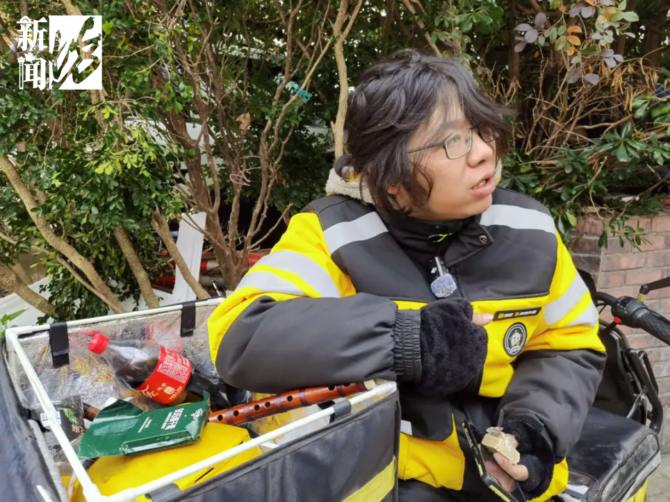 12月9日下午2点不到,记者在武定西路上找到了等红灯时吹笛子的外卖小哥赵越,“85后”的赵越是一名从业四年的“老骑手”,刚忙完一天当中最忙的午餐时段后,他正坐在外卖送餐车上抓紧啃着随身携带的压缩饼干。