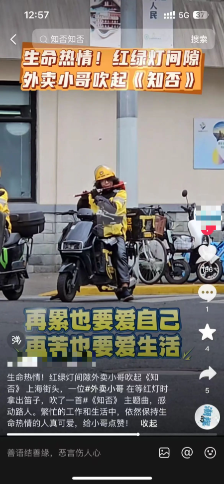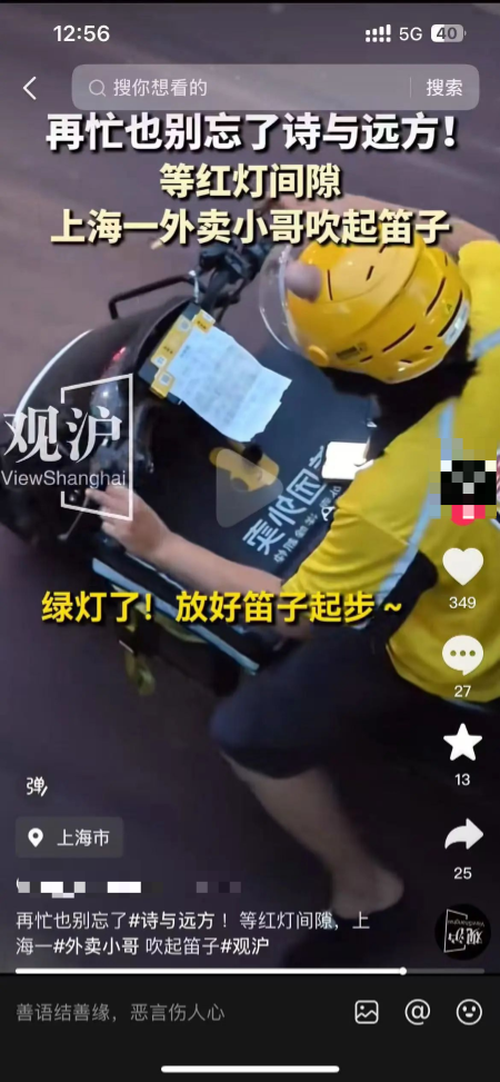 在上海的大街小巷,外卖小哥们一直和时间赛跑,但近日,一段特别的视频在网络热传,一位外卖小哥在静安区某路口等红灯的间隙拿出了随身携带的笛子,演奏了一首曲子。