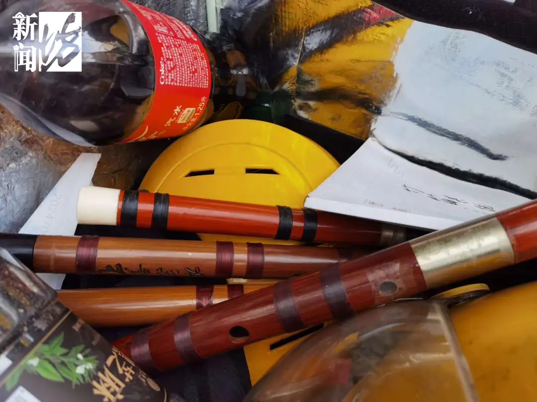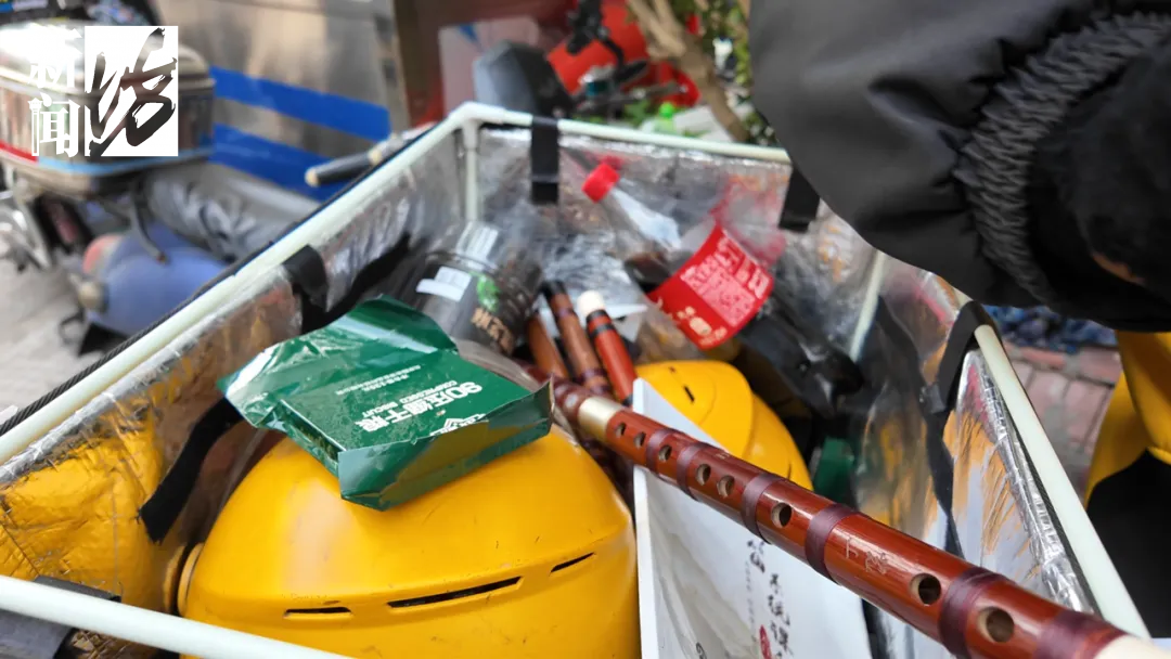 见到记者后,赵越一边吃着饼干,一边很快打开了身后的“物品箱”,只见里面装了四支竹笛、一包压缩饼干、一个安全头盔,还有可乐等物品。