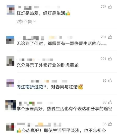 笛声悠扬又治愈,有网友评论“红灯是热爱,绿灯是生活”“无论到了何时,都要有一颗热爱生活的心”。