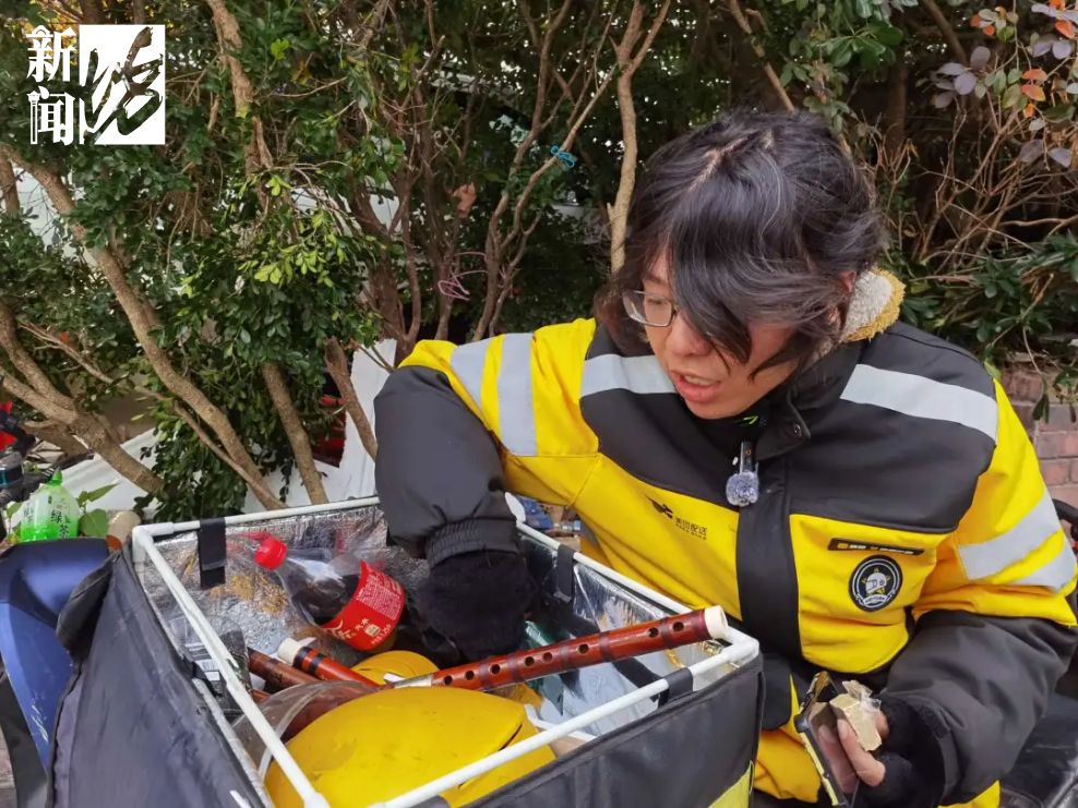 赵越说,自己有两个箱子,前面的餐箱是专门用于客户的送餐,另一个则是放了自己的宝贝竹笛以及个人用品。