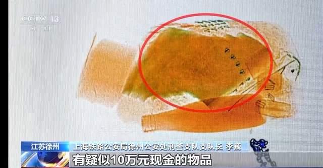 上海铁路公安局徐州公安处刑警支队支队长 李巍:安检监控上清晰地显示到她带的手提袋里面有疑似10万元现金的物品。确实在成像安检成像上面显示她说的是真实情况。