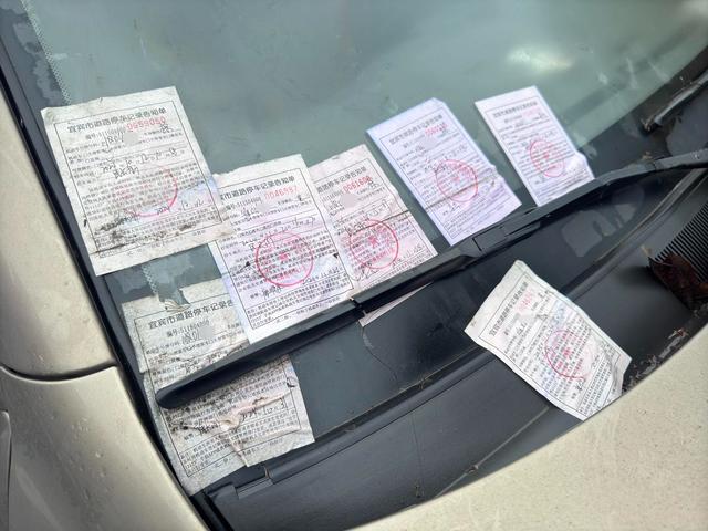 10日上午,柏溪街道细雨飘落,违停车上的7张《宜宾市道路停车记录告知单》已湿透,依然附在汽车前挡风玻璃上。该车车牌为川Q016**,系一辆奇瑞E5,车型为5座小型客车。