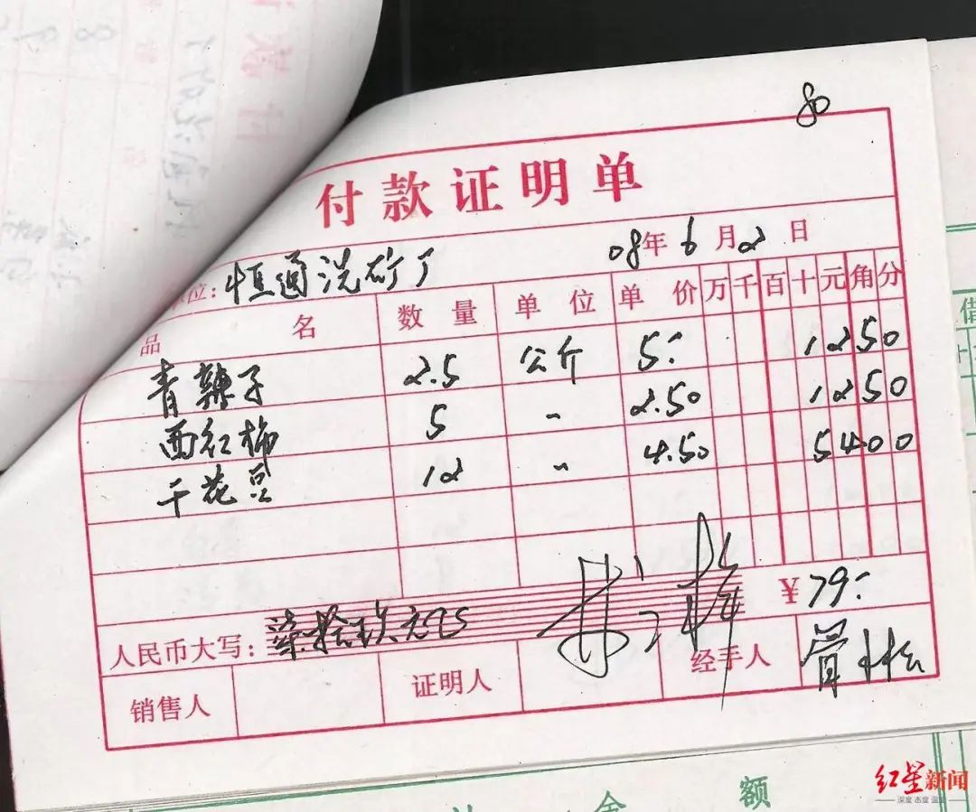 当时在恒通矿业有限公司打工的胥小松是曲靖市麒麟区人,有“寻衅滋事”犯罪前科。多份《付款证明单》证据显示,2008年,胥小松是恒通洗矿厂的采购员,当年6月2日,其采购了青辣子、西红柿、干花豆共计79元。