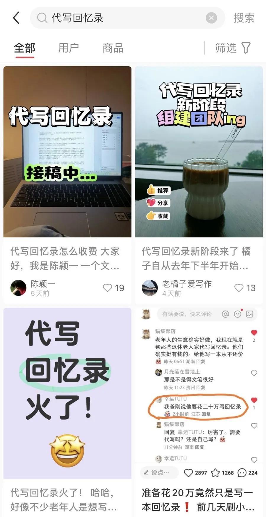 打开小红书,以“代写回忆录”为关键词搜索,记者发现,有近万篇记录写作经历或个人经验的笔记,有些笔记的点赞量甚至上千。其中,为老年人代写回忆录的业务最为红火。