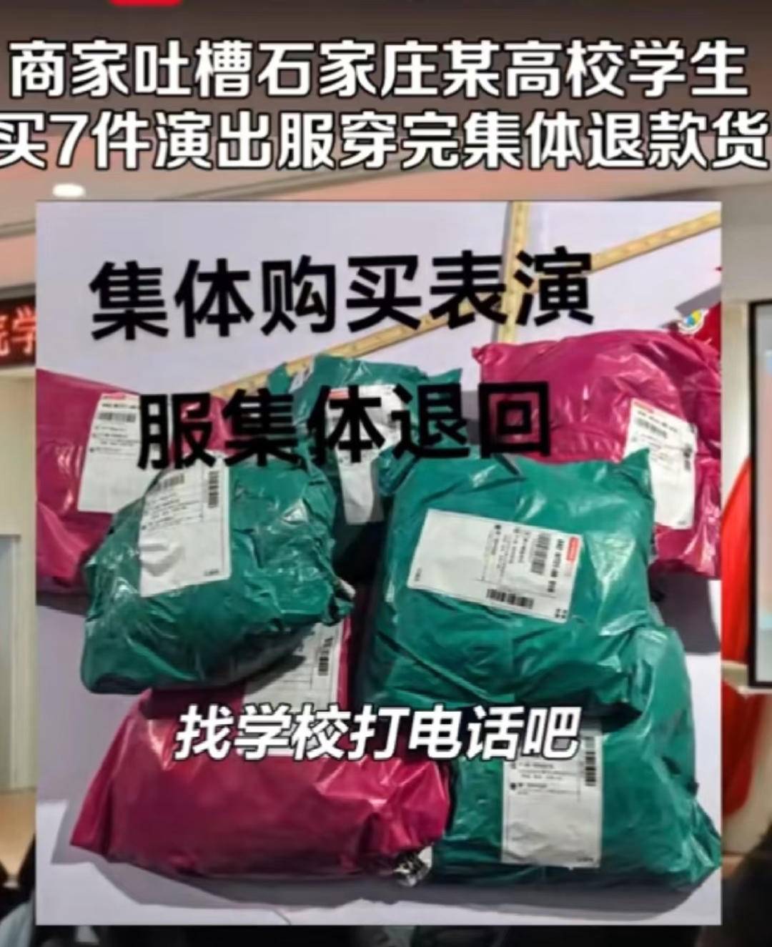 12月7日,山东一商家发视频称,自家店铺被河北石家庄某职业学院学生集体退回演出服。商家许先生表示,他收到售后拆退件发现,7件演出服的退货地址全都是该学校,“随机挑出两三件衣服,吊牌被摘了,裤腿都是脏的,这肯定是穿过的,一件衣服大概70多元。”商家在平台联系买家,对方不正面回答且一直催着退款,平台就自动退款了。该商家表示,之前也经常碰到这种情况,作为商家真的很“受伤”。