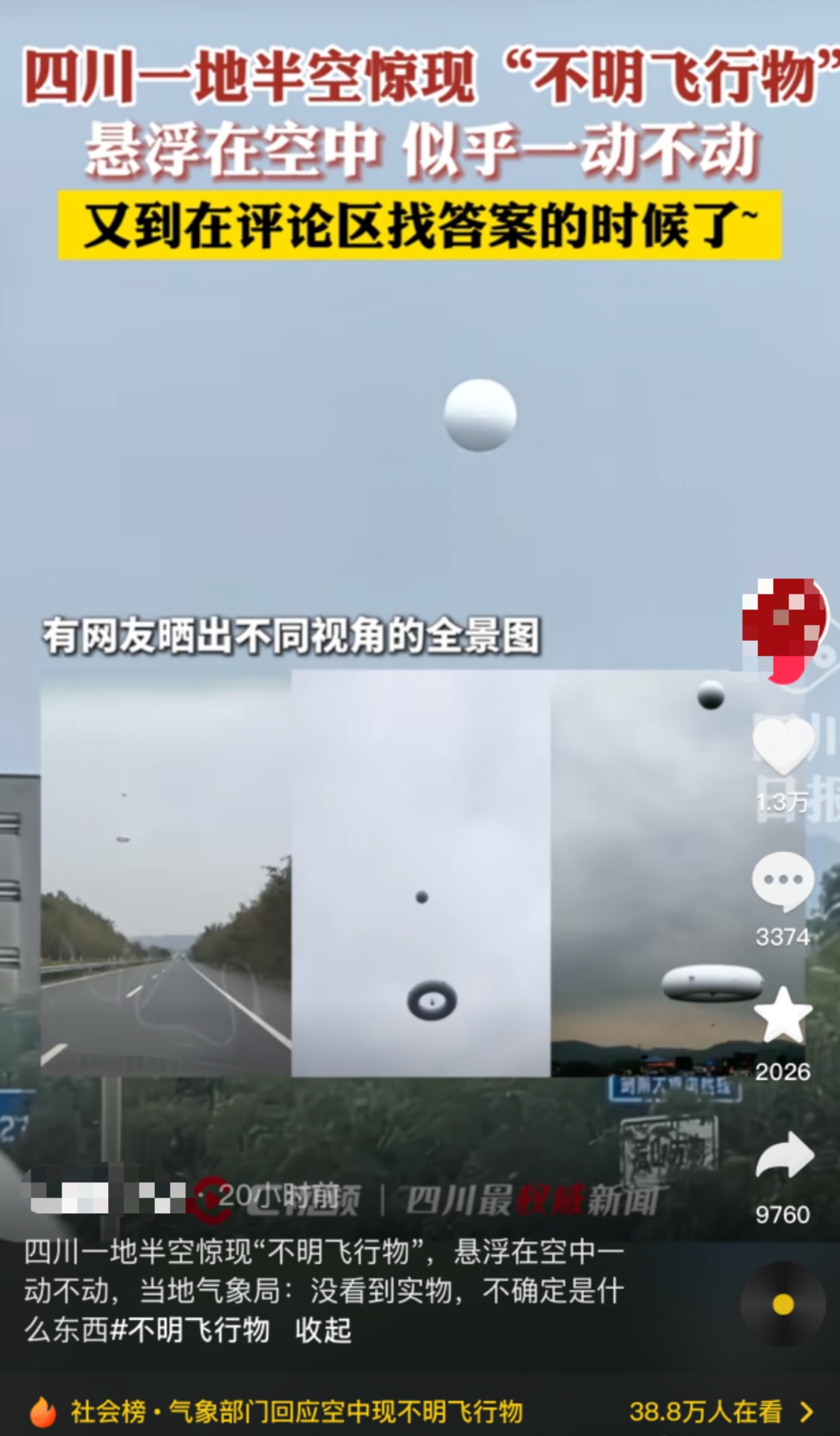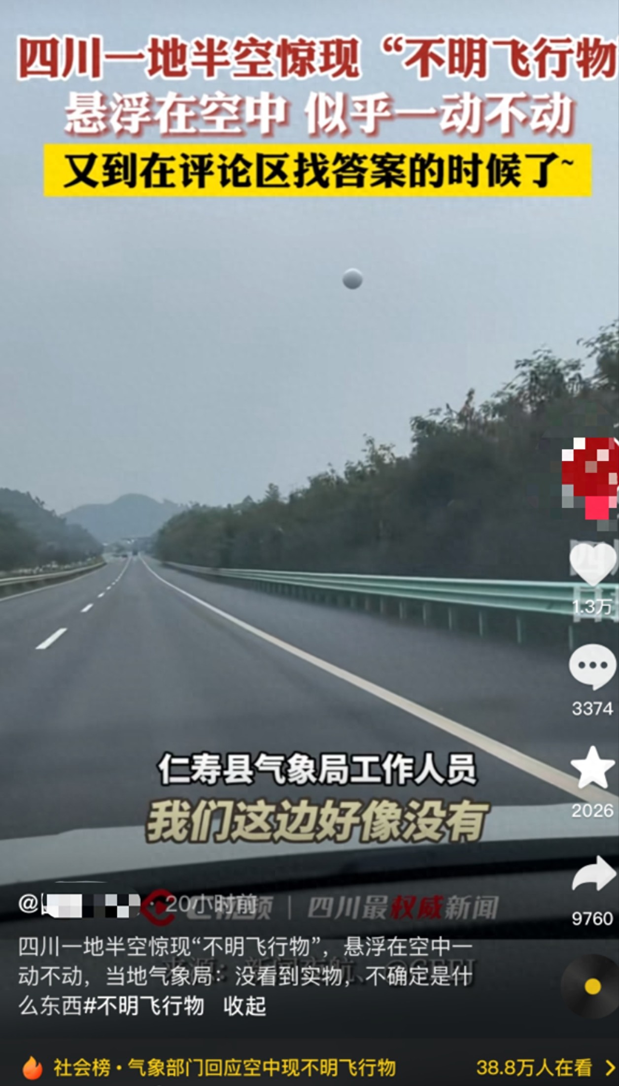 12月11日,多家媒体引用一段网传视频称四川一地半空惊现“不明飞行物”,有网民无意间拍到半空中漂浮着一个白色球体。视频发布后引发网民热议,纷纷猜测白色球体到底是什么?此外视频中还有一段采访录音备注为“仁寿县气象局工作人员”对现象进行回复。
