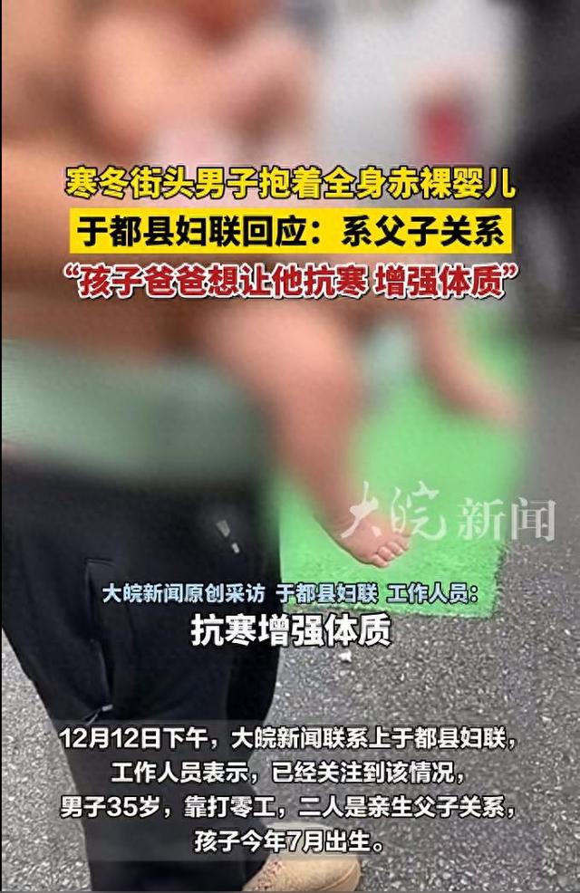 近几日,江西省赣州市于都县一男子打赤膊,抱着孩子在街头,孩子赤身裸体,有路人拍下视频,引发关注。