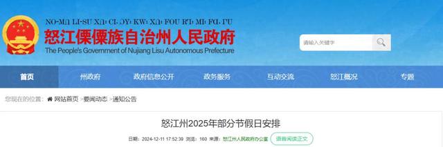12月11日,怒江州人民政府门户网站发布《怒江州2025年部分节假日安排》,其中,即将到来的阔时节、元旦放假共6天。