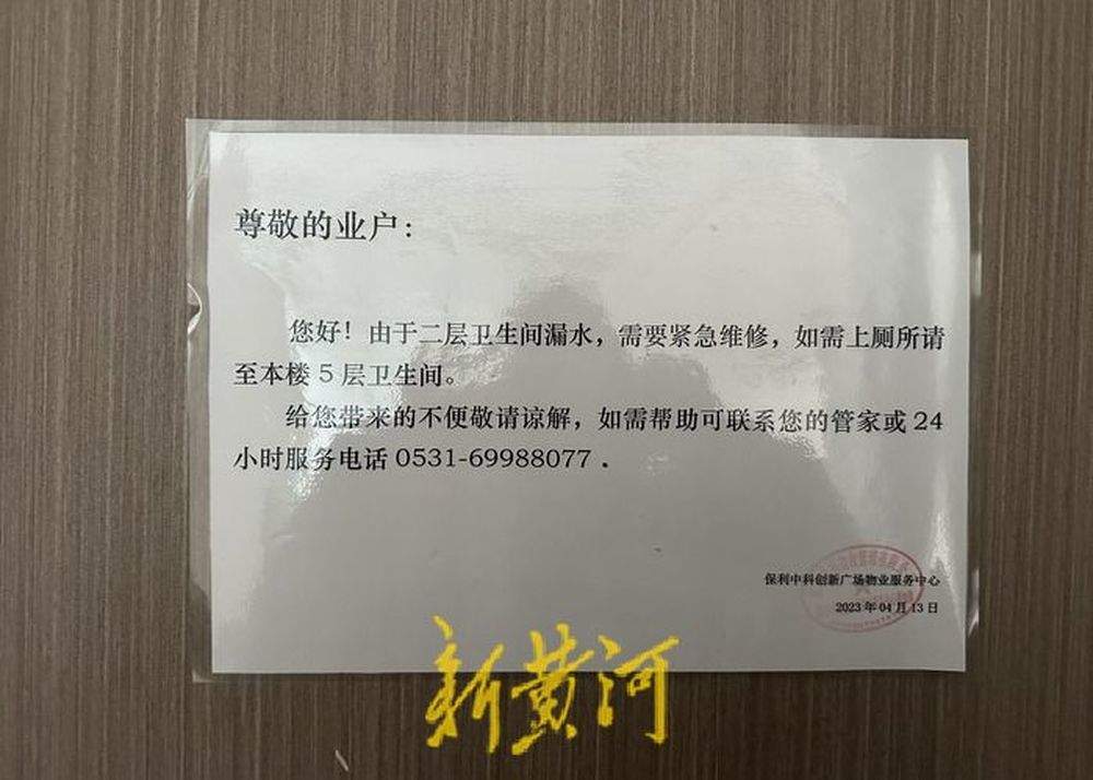 记者在二楼公厕门口看到了一张告知书称,“由于卫生间漏水,需紧急维修,如需上厕所请至本楼5层卫生间。”落款时间为2023年4月13日。随后记者在5层卫生间门口看到,“此卫生间关闭,如有需求请转至13号楼一层卫生间。”