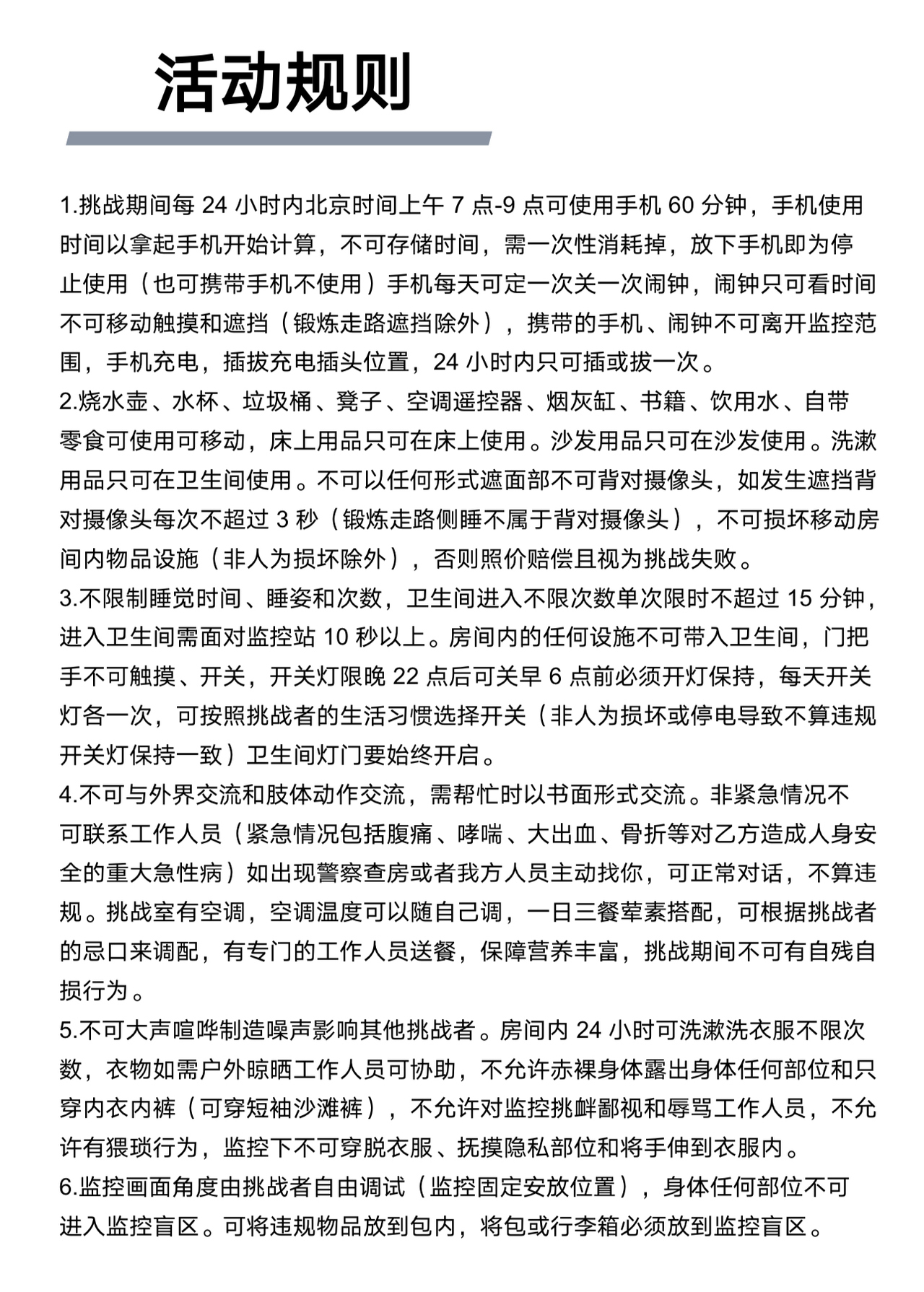 但实际上,规则中不被允许的事项种类繁多,比如手机每天可定一次关一次闹钟,闹钟只可看时间不可移动触摸和遮挡(锻炼走路遮挡除外),携带的手机、闹钟不可离开监控范围,手机充电,插拔充电插头位置,24小时内只可插或拔一次;不可以任何形式遮面部不可背对摄像头,如发生遮挡背对摄像头每次不超过3秒;卫生间进入不限次数单次限时不超过15分钟,进入卫生间需面对监控站10秒以上;不可与外界交流和肢体动作交流;不可大声喧哗制造噪声影响其他挑战者等等。