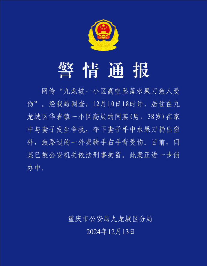 重庆九龙坡警方:一男子高空扔刀致一人受伤,已被刑拘