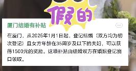 近日,一张题为“厦门结婚有补贴”的文字截图在网上传播,图中提及“在厦门,2025年1月1日起符合条件的夫妇登记结婚可以在婚姻登记窗口领取1500元奖励”。