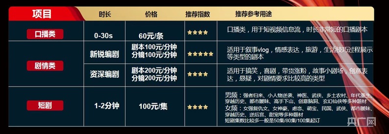另一家定制苦情戏剧本的商家称,不同级别的编剧收费不同。例如,普通编剧创作的剧本需要100元/分钟,资深编剧进行创作,需要200元/分钟。其中,婆媳关系、夫妻关系和家庭生活等一些“苦情戏”剧本,在中老年受众中比较受欢迎。