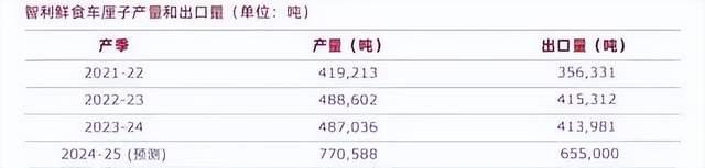 智利水果出口商协会早前预计,2024/25产季的智利车厘子将迎来创纪录的产量,预计出口量将比上一产季增长50%,约达1.245亿箱(每箱5公斤),全球出口总量约62万吨。