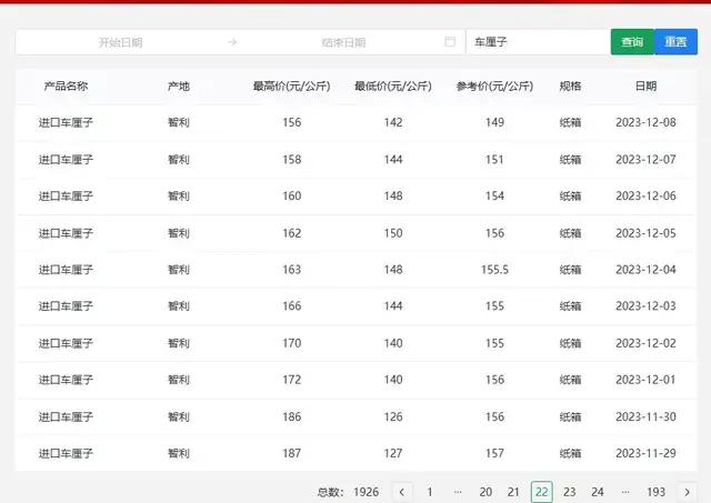 “12月海运到货后,一斤能跌破50元。”苏伽表示,2.5kg的原箱,预计12月中下旬售价能达到250元/箱。