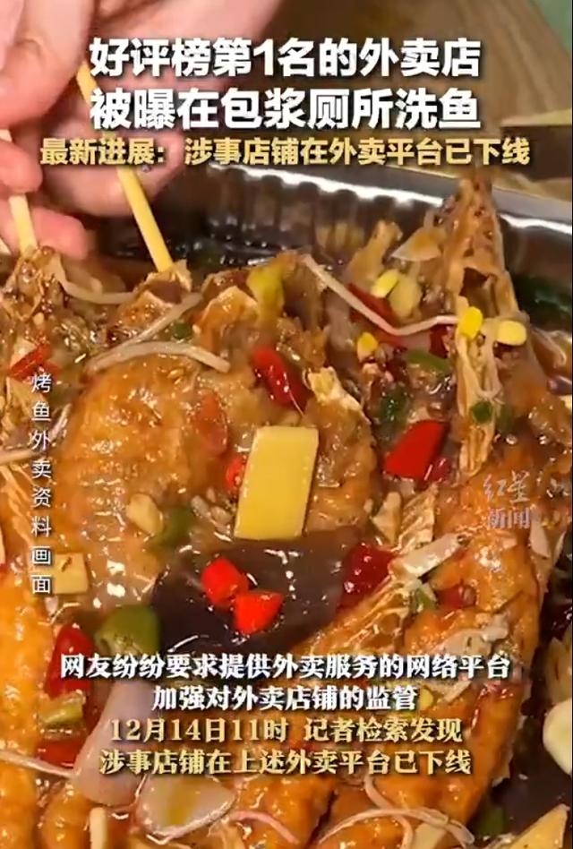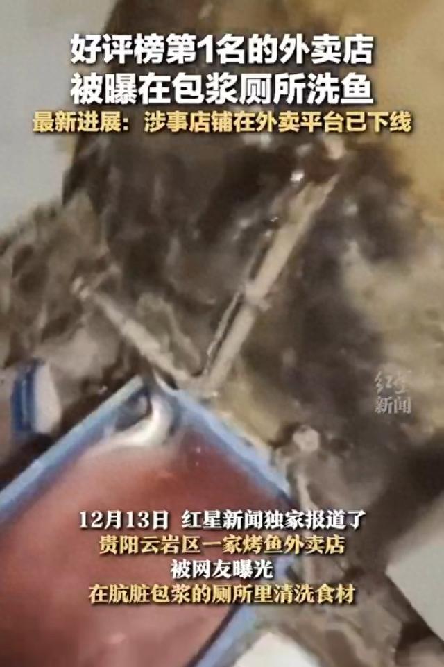 12月13日,红星新闻独家报道了贵阳云岩区一家烤鱼外卖店被网友曝光,在肮脏包浆的厕所里清洗食材。被剖开的鱼,直接堆放在蹲坑旁的地上,墙面地面满是发霉发黑的污垢。涉事外卖店在外卖平台获五星好评,系区域好评榜第1名店铺 ,月售破千单。