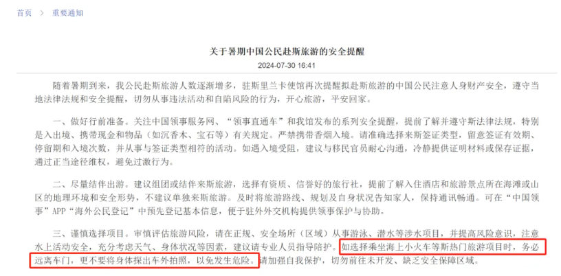 中国驻斯里兰卡大使馆指出,使馆曾多次发布领事提醒,要求中国公民在斯里兰卡乘坐火车时务必远离车门,更不要将身体探出车外拍照,以免发生危险。后续,使馆将加大提醒力度,全力保护中国公民安全。