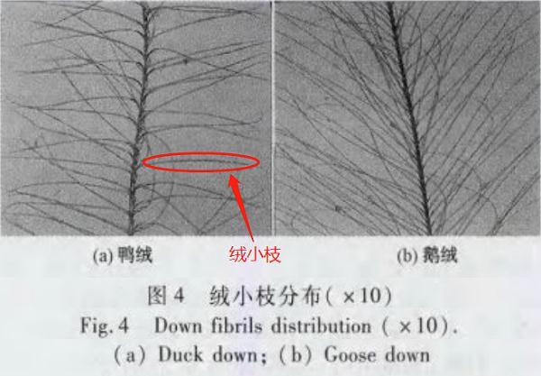 鸭绒的绒核宽度0.1~0.5mm,较粗而硬,而鹅绒绒核宽度在0.05~0.4mm,细软而干瘪。所以鸭绒中没有保暖功能的“废物”含量较高。