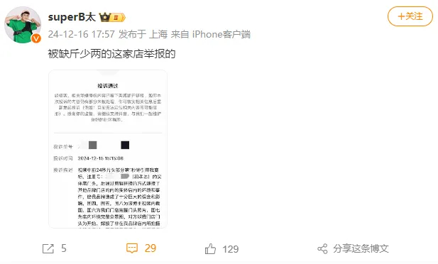 最后,B太表示,自己没有删除视频,是被投诉下架了。他还发文称:“是缺斤少两的店举报的。”