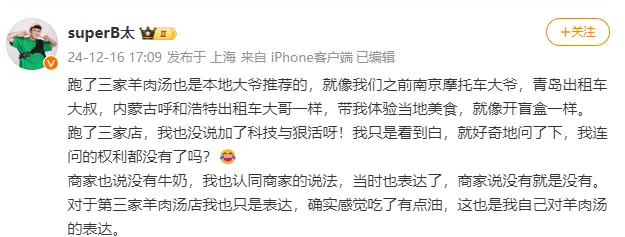 B太称:“跑了本地大爷推荐的三家羊肉汤,我也没说加了科技与狠活呀!我只是看到白,就好奇地问了下,我连问的权利都没有了吗?”