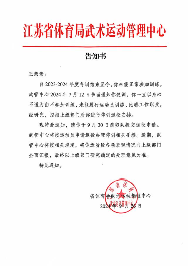 王亲亲告诉都市现场记者,自那以后,他开始患上抑郁症。9月26日,他收到了一份来自江苏省体育局武术运动管理中心的告知书,以未能履行运动员训练、比赛工作职责为由,他将被停训退役。“那段时间我要请假看病,领导却一直不给我批假。”