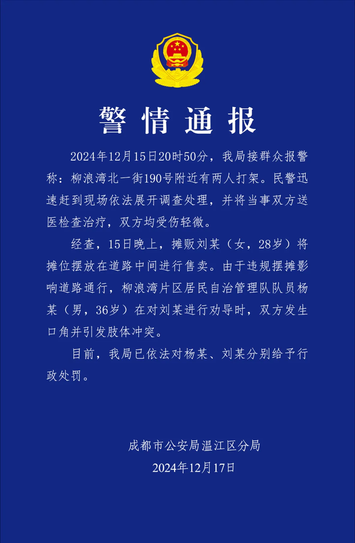 成都温江警方12月17日通报,12月15日20时50分,警方接群众报警称,柳浪湾北一街190号附近有两人打架。民警迅速赶到现场依法展开调查处理,并将当事双方送医检查治疗,双方均受伤轻微。经查,15日晚上,摊贩刘某(女,28岁)将摊位摆放在道路中间进行售卖。由于违规摆摊影响道路通行,柳浪湾片区居民自治管理队队员杨某(男,36岁)在对刘某进行劝导时,双方发生口角并引发肢体冲突。目前,已依法对杨某、刘某分别给予行政处罚。