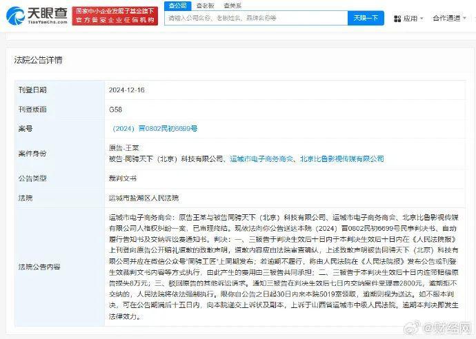天眼查App显示,近日,山西省运城市盐湖区人民法院向运城市电子商务商会公告送达民事判决书等,涉及原告王宝强与同骋天下(北京)科技有限公司、北京比鲁影视传媒有限公司及该商会人格权纠纷一案。公告显示,上述三被告被判向王宝强公开赔礼道歉,赔偿王宝强损失8万元,并交纳案件受理费2800元。