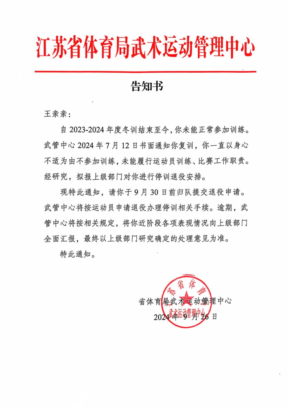 王亲亲称,自那以后,他开始患上抑郁症。9月26日,他收到了一份来自江苏省体育局武术运动管理中心的告知书,以未能履行运动员训练、比赛工作职责为由,他将被停训退役。“那段时间我要请假看病,领导却一直不给我批假。”