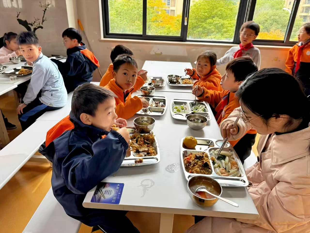 杭州市东城外国语实验学校自2022年建校以来,一直实行“师生同餐”制,学校就没设置过教师餐厅、没给老师另起过炉灶。