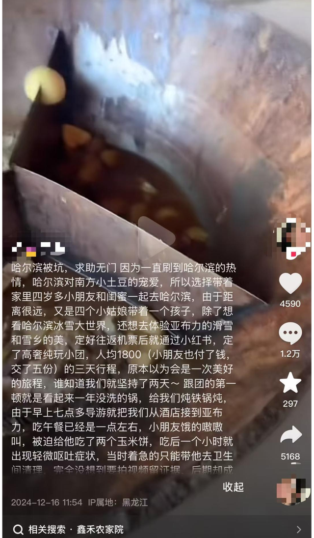 12月16日,一网友发帖称自己到哈尔滨旅游“被坑”。据其描述,其一行人参加“高奢纯玩小团”:“人均1800元的三天行程。跟团第一顿就是看起来一年没洗的锅,给我们炖铁锅炖……吃后一个小时(小朋友)就出现轻微呕吐症状。”其还称,在后续旅游中,曾被要求再交1380元的自费项目,否则后期行程里只能待在景区休息室,“如果选择待在车上,车也不能开空调,为了小朋友不被冻伤,无奈选择自费。”