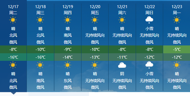 同时,新疆寒意持续在线,首府乌鲁木齐未来几天最高气温将在零下10℃上下,最低气温在零下15℃左右,天寒地冻,保暖工作不能放松。