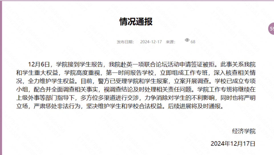 17日下午4时许,浙江大学经济学院发布通报称,12月6日,学院接到学生报告,学院赴英一项联合论坛活动申请签证被拒。学院第一时间报告学校,立即组成工作专班,核查相关情况,目前,警方已受理学院和学生报案,立案开展调查。