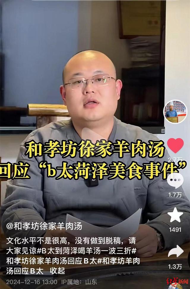 12月16日,“和孝坊徐家羊肉汤”创始人徐峰发布视频,针对“B太”提到的“菏泽羊肉汤清汤收不收费”“汤为什么会是奶白色”“一碗羊肉汤有多少羊肉”等问题,进行了回应。