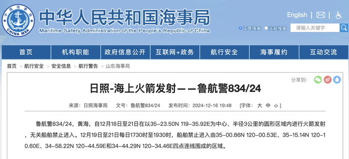 据中国海事局网站消息,日照海事局发布航行警告,12月18日至21日在黄海部分区域内进行火箭发射,无关船舶禁止进入。12月19日至21日每日17时30分至19时30分,船舶禁止进入部分区域。